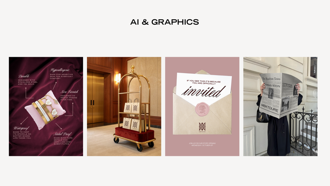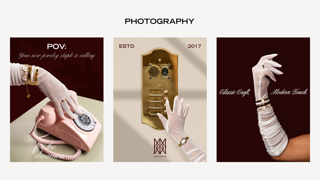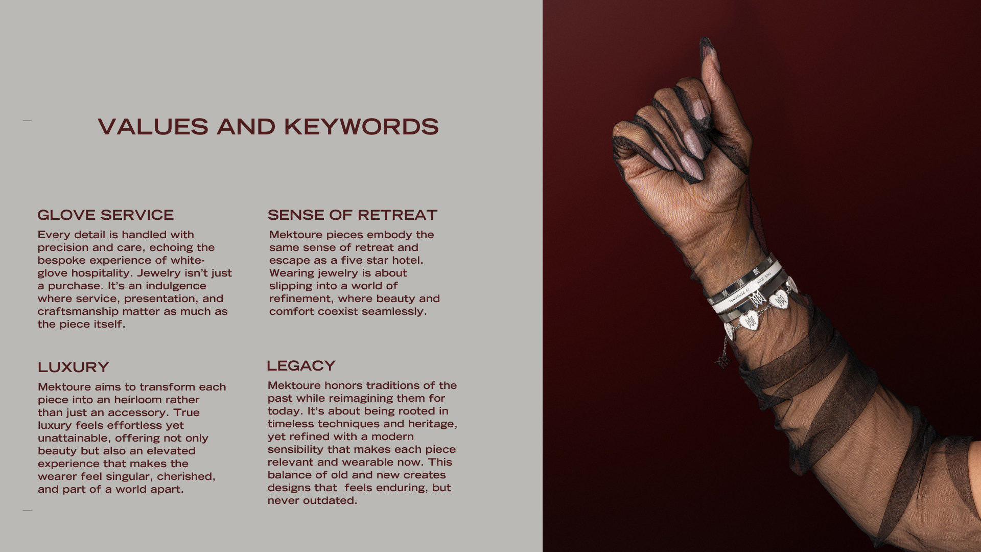 To bring this concept to life, I led the creative direction, website build, and social media launch strategy. The core goal: position Mektoure as “legacy craftsmanship for the modern lifestyle” by fusing the worlds of luxury hospitality and high jewelry.